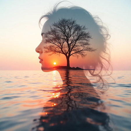 Double exposure portrait of young woman and tree at sunset in her head