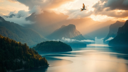 A serene mountain lake at dawn background with calm waters, rising mist, and the textures of rugged peaks and tranquil reflections, creating a peaceful and majestic natural scene.