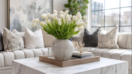 Discover an elegant living room featuring a stunning white tulip floral arrangement on a modern marble table. This bright space offers stylish decor and a cozy ambiance.