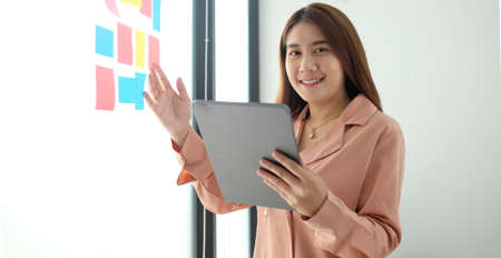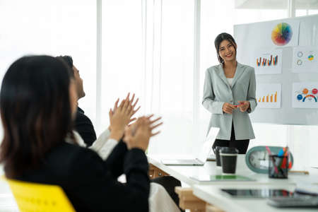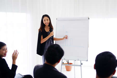 Young attractive Asian business women standing presenting project to the committee in the office. Happy Smart confident woman writing her idea on the board. Teamwork meeting at the office.