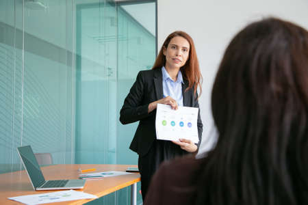 Professional pretty businesswoman standing and showing graphs. Confident red-haired manager in suit holding paper, meeting and presenting project. Business and management concept