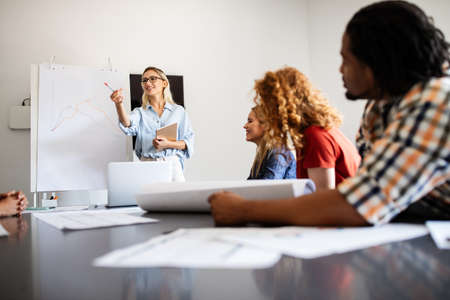 Caucasian woman offering information on board to people on the team for planning of working a team at meeting room. Meeting business concept.