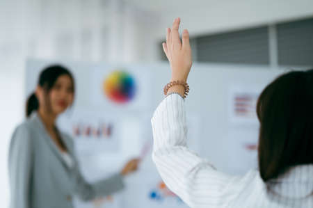 Asian woman Lecturer is lecturing about business and stock market topics and business people are interested in the knowledge in the economics class in meeting room at university.