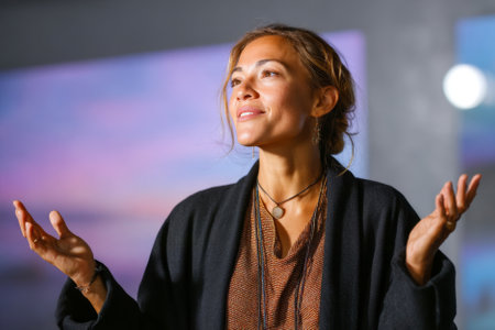 Woman in denim jacket speaking passionately during a public event, making expressive gestures and connecting with the audience from stage.