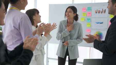 Businesswoman proficiently present work project receive celebrations from team . Corporate business team collaboration concept .