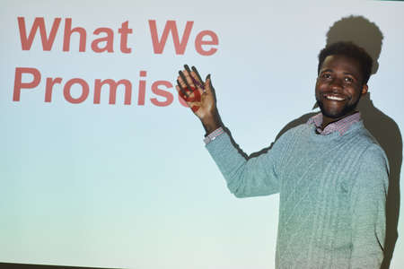 Positive handsome young Black businessman in sweater standing by projection screen and presenting marketing project