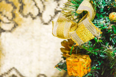 Closeup photo of little artificial green Christmas and New Year Fir-Tree with gold foil wrapped gift box, fir tree cone and gold ribbon bow