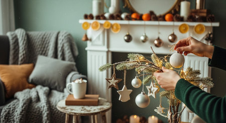 Cozy living room in Scandinavian style decorated with New Year decor. Photo