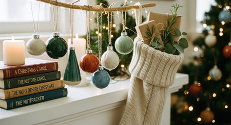 A cozy holiday scene featuring colorful ornaments hanging from a branch, a knitted stocking filled with gifts, and stacked classic Christmas books on a white table