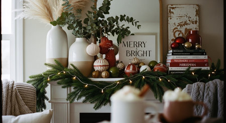 A cozy holiday-themed mantel display featuring decorative vases, ornaments, and greenery, with a merry & Bright sign