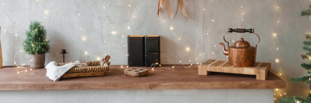 Home New Years kitchen interior. Decorations with garlands and a Christmas wreath. Cozy atmosphere of a home holiday, loft-style interior design, Scandinavian style.