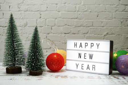 Happy New Year word in light box with Christmas tree and LED cotton ball decorative
