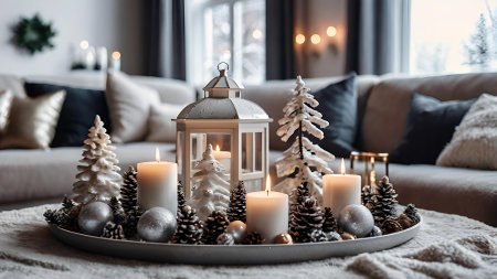 stylish christmas table centerpiece featuring silver ornaments a lit candle and white flowers. perfect for luxury winter interior design, holiday home staging, and festive celebration atmosphere.