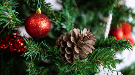 Amidst the evergreen branches, a Xmas elements decoration adorns the tree with festive Christmas red balls and a pinecone, creating a beautiful and celebratory atmosphere.