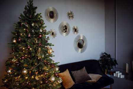 Beautiful modern gray apartment room, decorated for New Year and Christmas. Cute Christmas tree in a yellow garland and golden Christmas balls.