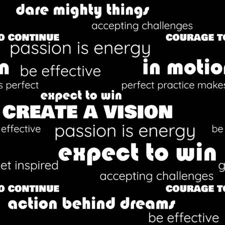 Seamless trendy typography vector pattern with white words related to inspiration, motivation, achievement, dream and active lifestyle on black background designed for web, fabric, paper and all prints