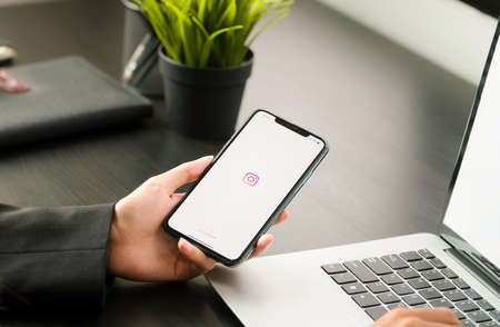 CHIANG MAI, THAILAND - AUG 26, 2020: A woman holds Apple iPhone X with Instagram application on the screen at cafe. Instagram is a photo-sharing app for smartphones.