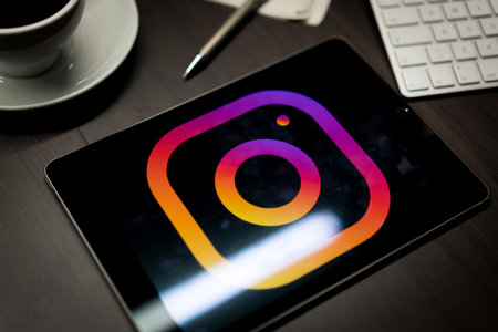 New York, New York / USA - 11 11 2019: Logo of Instagram on the iPad Air2 in on office desk