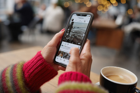 A person holds a phone displaying social media content while sipping a warm beverage in a cafe.