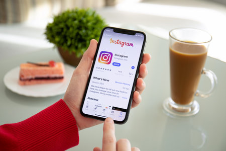 New york, USA - july 22, 2019: Using instagram mobile app close up view, smartphone in hands