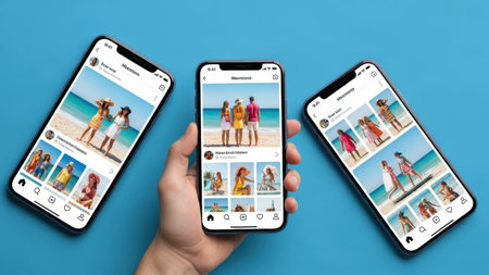 Modern smartphone displaying a curated Instagram feed with diverse content showcasing nature. home decor. food. and lifestyle. Ideal for social media. advertising. and design projects.