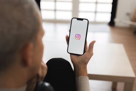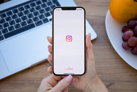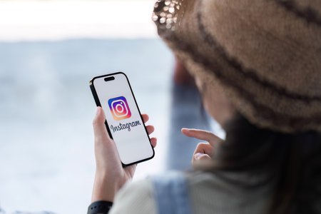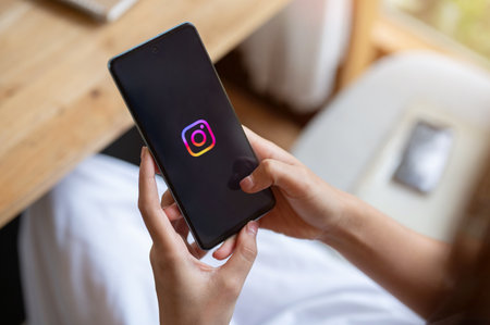 CHIANG MAI, THAILAND - JUL 20 2024: A woman holds Apple iPhone 14 with Instagram application on the screen at cafe. Instagram is a photo-sharing app for smartphones