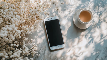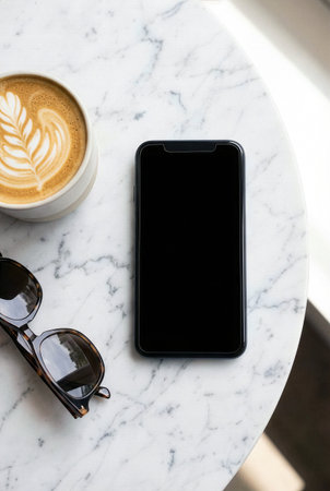 Flat Lay with Black Screen Smartphone Mockup, Latte, and Sunglasses on White Marble Table. Modern workspace with smartphone mockup, coffee cup and sunglasses on marble table
