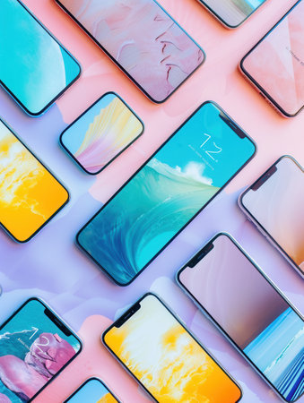 A collection of smartphones shows various short videos and stories, set against a bright, colorful backdrop in a modern setting.