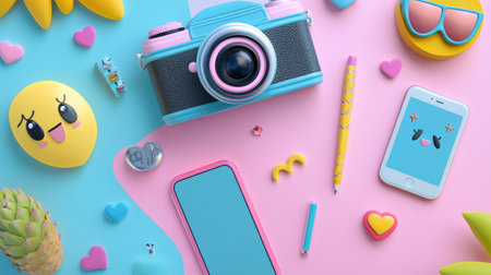 Creative tools like camera, phone, stylus and social media emoji symbols arranged neatly on pastel background