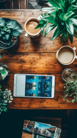 Generative AI : Blue coffee cup and tablet and plants in front of window