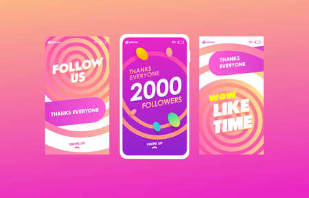 Follow us social media stories templates set. Like time, 20k followers congratulation social network promotional poster layouts pack.