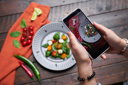 Hands holding smartphone capturing appetizing dishes with professional photography