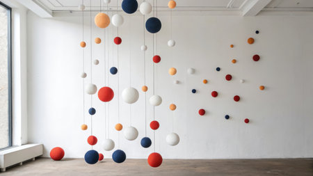 Colorful balls hanging on a white wall in the interior of the room