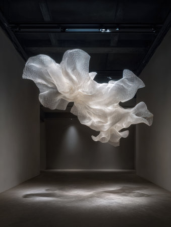 A delicate, floating sculpture crafted from sheer material is suspended from the ceiling in a contemporary art gallery, illuminated by soft light.