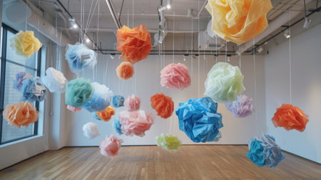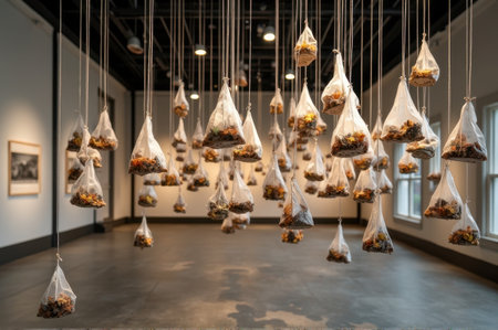 Contemporary art installation with hanging organic sculptures in gallery setting. That the image is generated using AI.