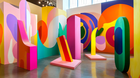 A vibrant display of colorful geometric shapes and abstract art fills the gallery, inviting creative exploration. A stunning visual experience, generated AI showcases modern artistic expression