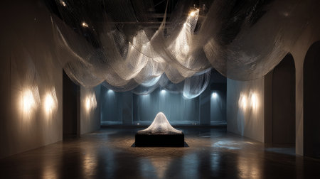 Gallery showcasing intricate textile installation, unique lighting creating atmospheric depth, artistic centerpiece, 3D render with a textured base