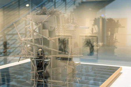 interior of a modern office building, note shallow depth of field. Exhibition of architectural designs and models, focusing on modern interior spaces and furniture arrangements.