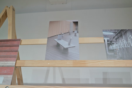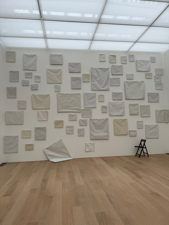 Wassenaar, Netherlands - June 28, 2025: Installation of blank canvases on wall at Voorlinden museum