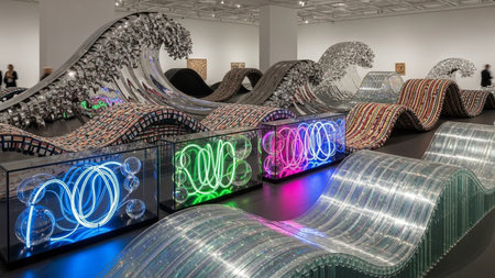 A contemporary installation flowing wave-like structures with vibrant digital light patterns and colorful sculptures...