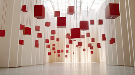 A collection of clear, floating cubes showcase vibrant seasonal and seaside scenery, creating an elegant, surreal display on a neutral gray canvas.