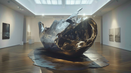 A sculpture of a large metal object sitting on top of wood floor, AI