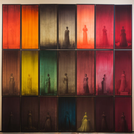 biedermeier panels in a range of vibrant hues are displayed in a grid, reminiscent of wet plate negatives. the minimalist approach is evident in the monochromatic color scheme, acrylic washes, and use of non-traditional materials. the dark palette and chiaroscuro lending the work a sense of depth. the instax process adds soft tonal transitions to the, ai generated