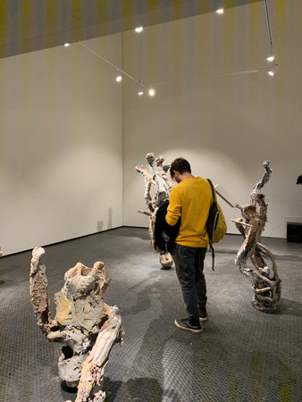 View of man visiting 16th Istanbul Biennial titled Exploring the Seventh Continent at Istanbul Museum of Painting and Sculpture.