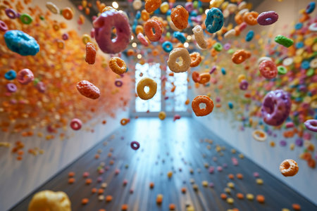 Assorted Colorful Donuts Hanging from Ceiling in Room Filled with Dozens of Delicious Treats