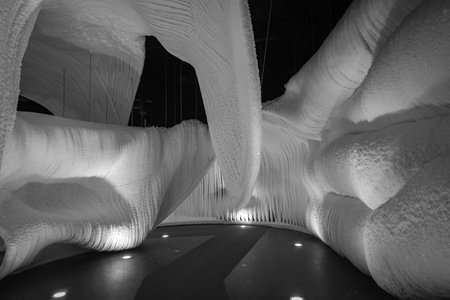 A large-scale installation undulating wave-like sculptures made from metallic, glass, and patterned illuminated by...