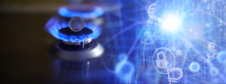 A vibrant blue flame flickers atop a sleek stove, encircled by fiery red numerical graphs, illustrating the intense fluctuations of global energy and financial markets.