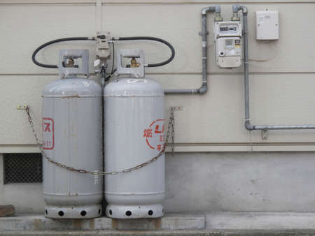 Orange gas cylinders connected to pipes on a concrete wall