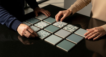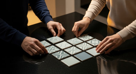 Two pairs of hands, a man and a woman, meticulously arranging decorative square tiles with various patterns on a dark, reflective surface. This activity suggests home renovation, interior design, or a collaborative planning process.