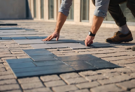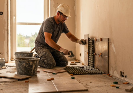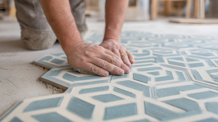 Tradesman is carefully placing ceramic tiles on a textured surface, highlighting the craftsmanship and precision involved in the renovation process